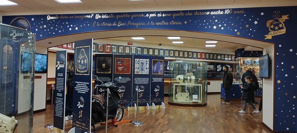 After taking several pictures of the Museum, the last part of the visit is dedicated to the Perugina Shop, where visitors can buy a wide range of chocolates, from the traditional bacio, to new products they created recently, with various variations. You can taste many different flavours: from an enveloping coffee bacio, to a milk chocolate bacio, to an harmonious white chocolate bacio, to the raspberry-flavoured gianduja heart, to a soft gianduja heart wrapped in a refined milk and caramel flavoured coating, capable of enriching and enhancing the taste of delicately roasted hazelnuts, that will win you over, to fresh lemon-flavored grains with crunchy whole hazelnuts, all wrapped in a delicate white chocolate coating with notes of vanilla, and last but not least, the extraordinary dark chocolate one that gives you a unique moment of pleasure.